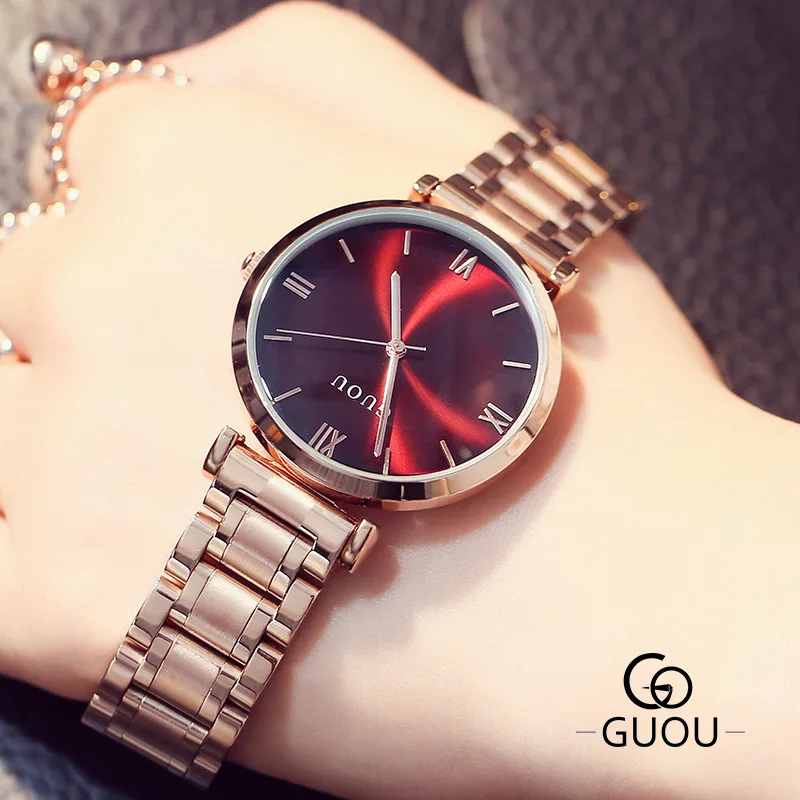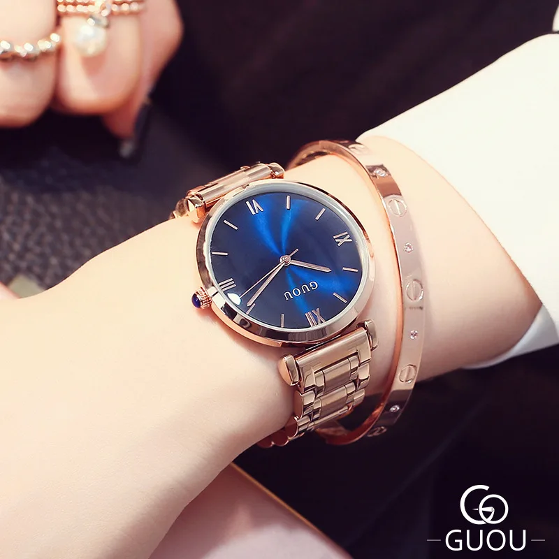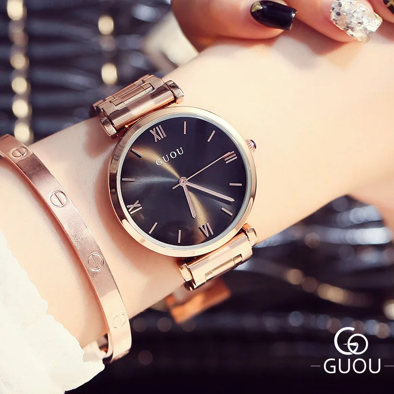 Rose Design Watch Women Top Luxury Brand GUOU Steel Bracelet Quartz Watch Ladies Elegant Wrist Watc